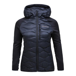Chinguard, Duck down, 700 fill power, 90/10 down/feather, Elastic binding at bottom hem, Elastic cuffs, Full front with reversed YKK coil zipper, Hanger loop outside neck, Hood with drawcord adjuster, Hybrid, Jersey panels, Lightweight, 42 gsm 20D ripstop. Windproof and repels light rain, Made without intentionally added PFAS, Midweight, 271 gsm flat fleece, soft brushed back that traps warm air. Dries quickly, Open hand pockets, P-logo embroidery at sleeve, Peak Performance embroidery at chest, Quilted in our iconic Helium pattern, Responsible down standard, Side panels in polyester jersey, Soft, midweight polyester fleece with brushed back, Sterilization Permit no. PA 9900(CN), Ultralight nylon ripstop, wind and water resistant, Zippered chest pocket